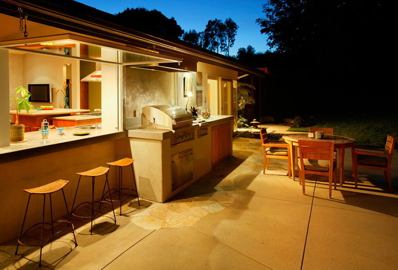 The rebirth of this 1970’s ranch house took a cue from the modernists and opened up the interior spaces. Corners are dissolved and glimpses are given through openings in the walls, allowing views into adjacent spaces or outside. The kitchen was conceived as a composition of floating planes intersecting teak masses.